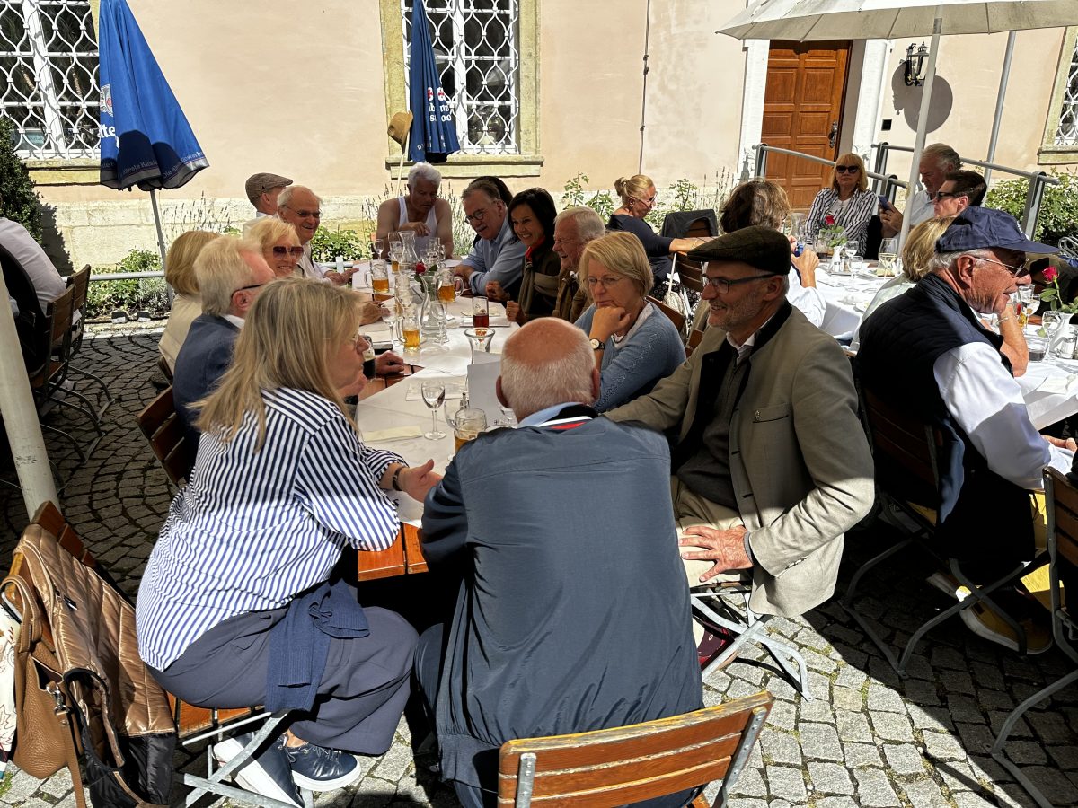 Danach weiter entlang des Altmühltals bis nach Breitenbrunn. Bei der Kapelle St. Maria scharf rechts abbiegen, den Berg hoch und auf der Jura-Hochebene den Ausblick, die Landschaft und die Strecke genießen. Gottseidank meist mit der Sonne im Rücken und ohne ladwirtschaftlichen Verkehr. Bei der Burg Prunn ging es dann über Serpentinen wieder ins Tal der Altmühl mit traumhaftem Ausblick auf die Burg Prunn und die Burgruine Randeck mit unserer Destiantion für den Abend, der Ritterschänke. Unser Eintreffen war von Familie Sturm professionell organisiert: Die örtliche Freiwillige Feuerwehr war vor Ort und verantwortlich für das Einweisen zum Parkplatz. Frau Sturm mit Mitarbeiterinnen begrüßte uns an der Einfahrt zum Parkplatz und hatte für alle ein Glas mit sprudelndem, vergorenem Inhalt zur Belohnung für die „Strapazen“ des Tages bereit. Nach dem Abschalten der Motoren stand noch eine Besichtigung der historischen Mauern der Burgruine auf unserem Programm, unterhaltsam geführt vom 2. Bürgermeister, Herrn Schneider. Vom Söller der Burg wurde man mit einem fantastischen Blick über das Altmühltal für die Mühe des Aufstiegs (36 m) belohnt.