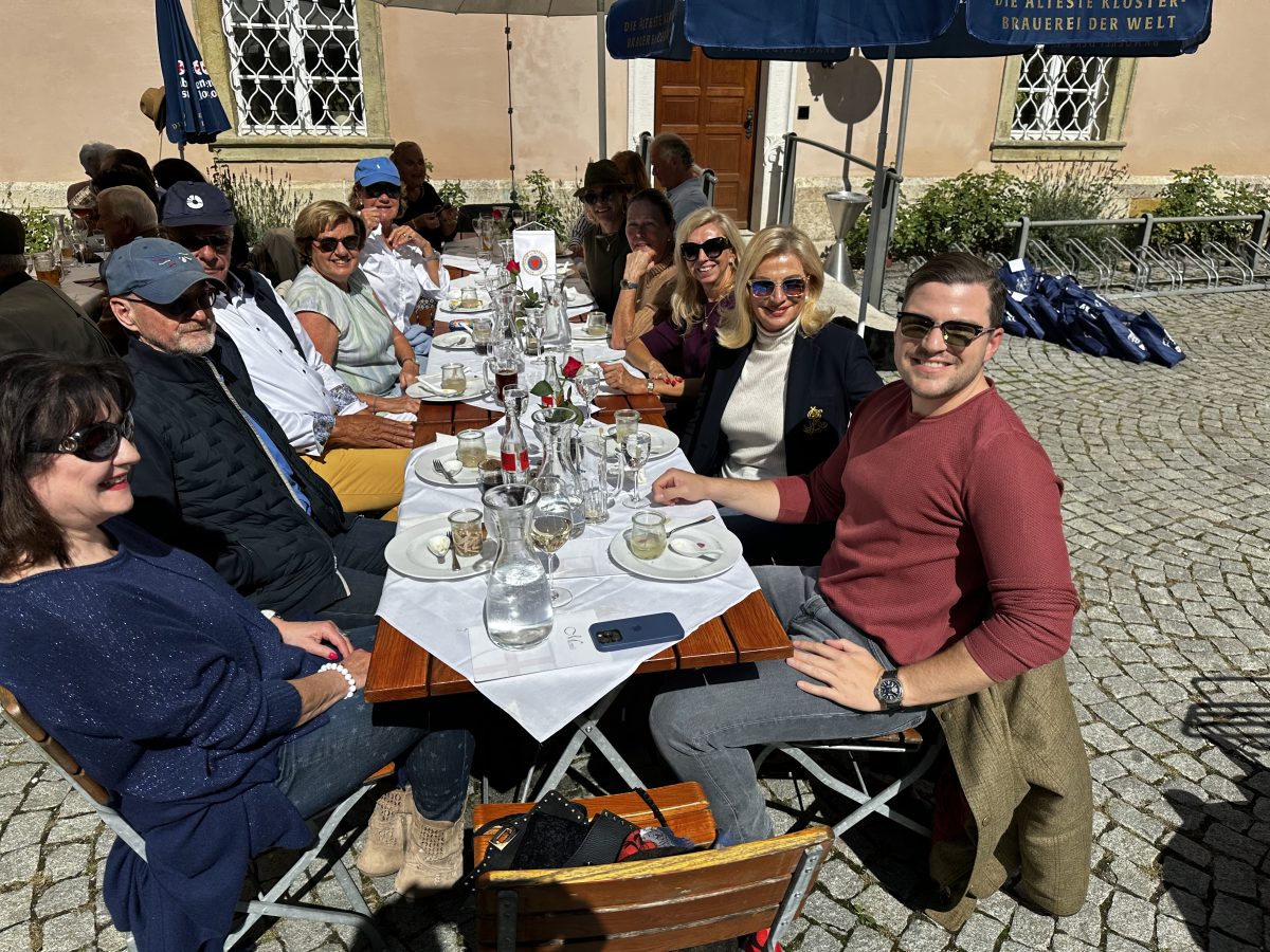Treff- und Startpunkt war der Biergarten der Klosterschänke Weltenburg, wo die Fahrzeuge optisch ansprechend direkt neben den Tischen parken konnten. Nicht nur zur Freude der Teilnehmer, sondern speziell auch der Gäste im Biergarten, die durch zahlreiche Fragen und geschossene Fotos ihr Interesse an den Fahrzeugen zum Ausdruck brachten. Für das „warm-up“ wurden nach individuellem Wunsch Getränke gereicht. Mit einem leichten Snack als Lunch aus klassisch bayerischen Vorspeisen und als Hauptgang geräucherte Forelle, oder Salat mit Putenbrust oder deftiger, mit Brauergulasch, wurden die Besatzungen auf „Betriebstemperatur“ gebracht. Noch die kurze Vorstellung der Teams, das obligatorische „Briefing“ zum Ablauf und den Besonderheiten der Strecke, dann konnte der Start pünktlich erfolgen. In „Formation“ ging es zunächst entlang der Donau bis Neustadt. Ab da durch den Naturpark Altmühltal über hügelige Landschaften und kleine Orte bis zur Rosenburg. In Rekordzeit eingeparkt, gerade rechtzeitig, um die Flugshow der hier beheimateten Greifvögel zu genießen. Im Anschluss wurden Erfrischungen im Burggarten serviert.