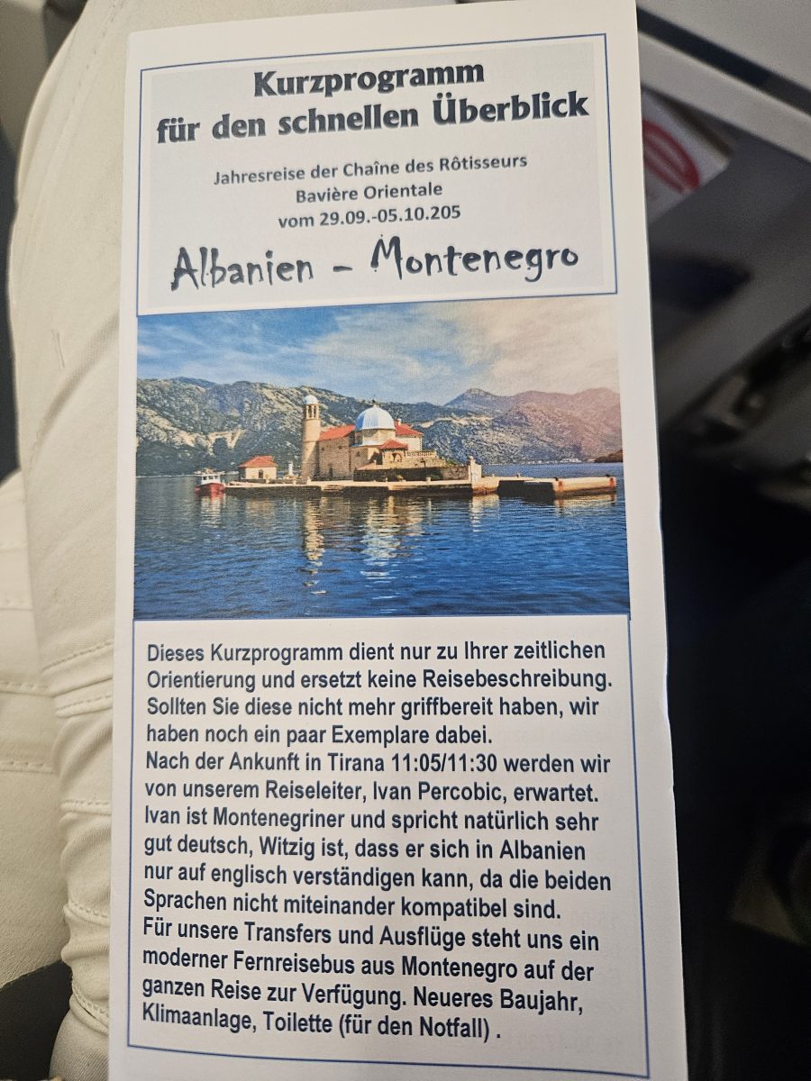 Auf nach Albanien! Schon beim Gedanken, dass künftig eine von KI geformte „Beraterin in Landestracht“ der Regierung bei Korruptionsfragen helfen soll, sind wir gespannt. Kirsten und Hartmut Wolff haben wieder eine Reise für die Chaîne de Rôtisseurs organisiert – eine fröhliche Truppe, die sich früh am Münchner Flughafen trifft. Bald tauchen die schneebedeckten Alpen aus den Wolken auf, und wir landen im sonnigen Tirana.