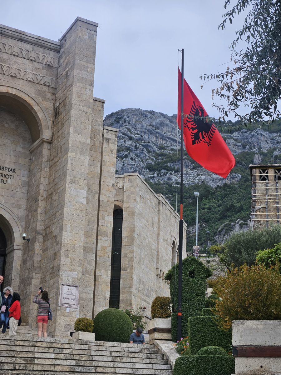 Gemütlicher Start – auf nach Kruja! Die alte Festungsstadt thront über dem Tal. George W. Bush war hier, was man an unzähligen Cafés „Bush“ erkennt. Wir erklimmen die rutschigen Pflasterwege, besichtigen das Skanderberg-Museum und hören vom ewigen Freiheitskampf der Albaner.