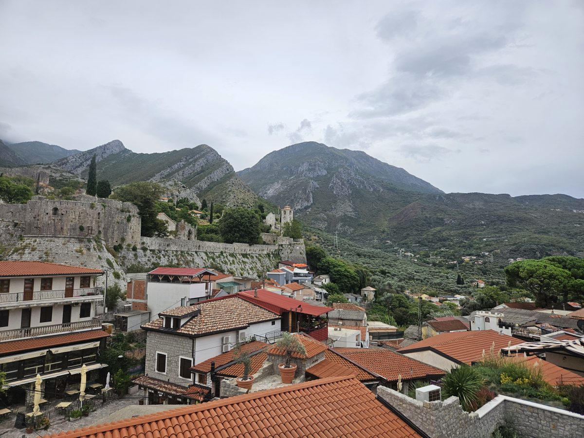 Der Sturm tobt, wir frühstücken in den Katakomben des Hotels. Bei Wind und Regen erkunden wir die Ruinenstadt Bar, von Illyrern bis Osmanen geprägt. Von der alten Festung sehen wir hinab auf Hafen und Meer – grau in grau, aber eindrucksvoll.