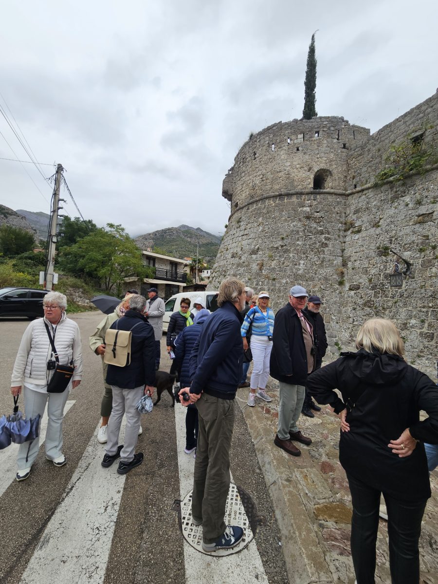 Weiter zum alten U-Boot-Bunker, wo uns Musiker in der Akustik des Tunnels überraschen – unvergesslich! Danach Mittag im „Adriatica“: Wolfsbarsch, Schokolade, Williamsbrand. In Perast bleibt Zeit zum Bummeln, Kaffee (mit Raki) und Aussicht genießen. Abends im „Conte“: Schinken, Käse, Fleischspieße, Mandeleis – und wieder: „Raki hilft immer.“ Perast glitzert im Wind.