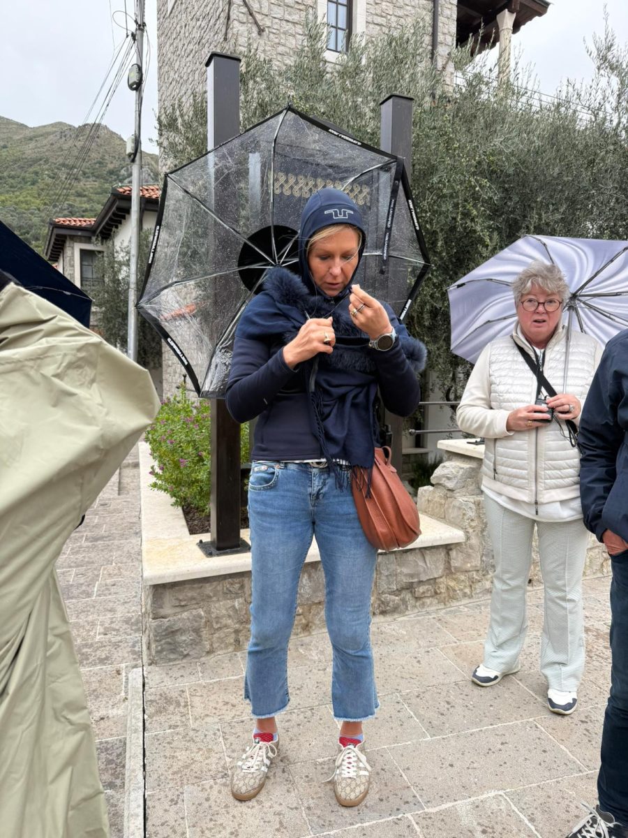 Ivan, unser montenegrinischer Reiseleiter, empfängt uns herzlich. Durch chaotischen Verkehr, Baustellen und bunte Straßenszenen geht es zum „Agro Tourismo Blerina“, wo uns duftende Kräuter, selbst gezogener Salat und kräftiger Wein erwarten. Zurück in der Stadt erleben wir Tirana: Plattenbauten neben Designfassaden, Moscheen, Glitzerkleider und Blumenkioske. Beim Stadtspaziergang lernen wir die wechselvolle Geschichte zwischen Rom, Osmanen, Sozialismus und Demokratie kennen. Der Skanderbergplatz leuchtet im Abendlicht – ein wildes Mosaik aus Alt und Neu.